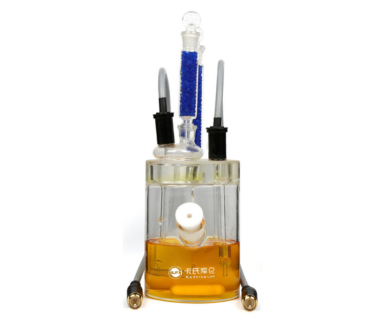 电解池:用于测定样品中的水分,由阴极室(电解电极)干燥管、电解电极、阴极室(电解电极内腔)、搅拌子、阳极室(电解池瓶)干燥管、测量电极、进样旋塞、阳极室(电解池瓶)组成。
